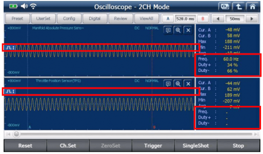 در مثال زير، در هر دو كانال B,A شكل موجهاي شبيه به هم نمايش داده شدهاند، اما با كمي دقت متوجه خواهيد شد كه هيچ ديوتي و فركانسي براي كانال B نمايش داده نشده است، زيرا سطح آستانه براي اندازه گيري فركانس و ديوتي نيازمند قرارگيري در محدودهي سيگنال ميباشد.