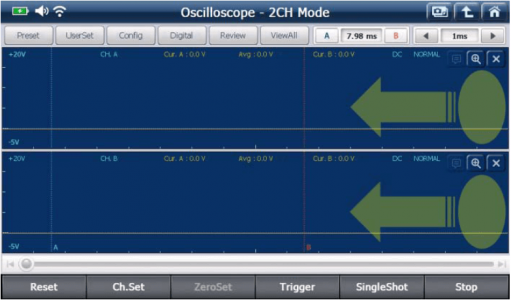 در حالت 2 كاناله (2ch) ، كانال B را ميتوان در حالت كاري اسيلوسكوپ يا حالت كاري اندازه گيري فشار توسط سنسور قرار داد.
