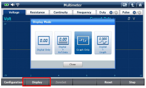 Configuration( پيكربندي): در اين قسمت ميتوانيد تنظيمات عملكرد مولتي متر را پيكربندي كنيد، مانند فعال يا غير فعال كردن راهنماي كاليبراسيون اهم متر، آزمايش پيوستگي با بوق و نمايش اطلاعات مرتبط در هنگام اندازه گيري فركانس/ ديوتي/ پالس همچنين در نيمهي پاييني اين قسمت ميتوان ضخامت سيگنال گرافيكي كه هنگام عملكرد اندازهگيري نمايش داده ميشود را از ميان 3,2,1 يا 4 نقطه انتخاب كرد.