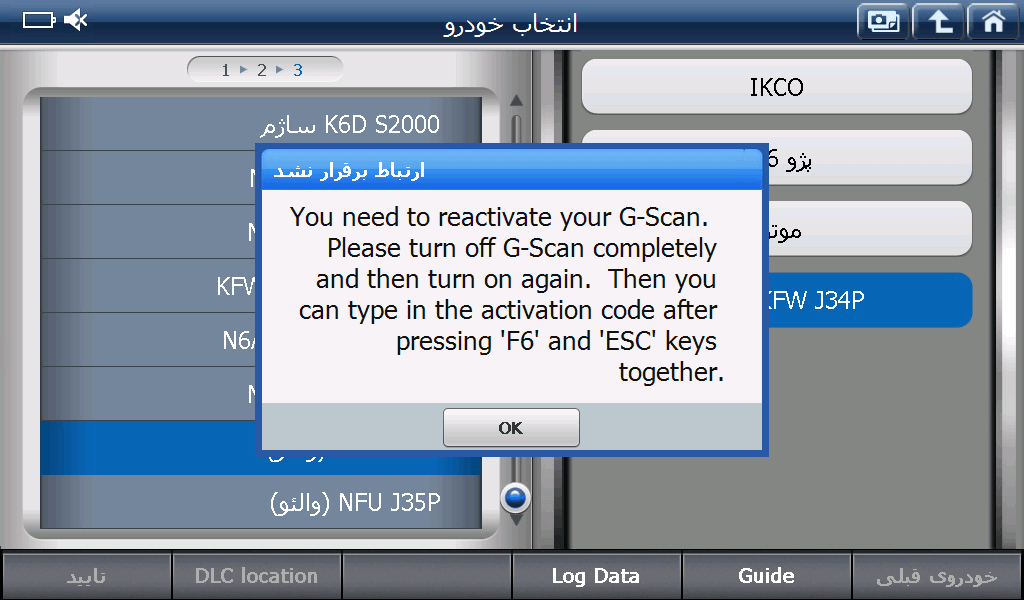پیغام بالا بدین معنی است که ” دستگاه جی اسکن شما نیاز به کد فعال سازی دارد. جی اسکن را خاموش کرده و دوباره روشن نمایید، سپس دکمه ی ‘F6‘را نگه داشته و همزمان دکمه ی ‘ESC‘ را فشار دهید، تا دستورالعمل دریافت کد فعالسازی را مشاهده نمایید.”