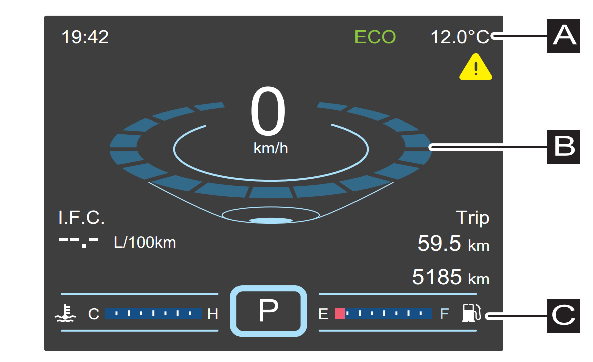 یک صفحه نمایشگر رنگی و چند منظوره در قسمت وسط قرار دارد. این صفحه نمایشگر رنگی نیز دارای چند بخش است که در تصویر زیر نشان داده شده است.