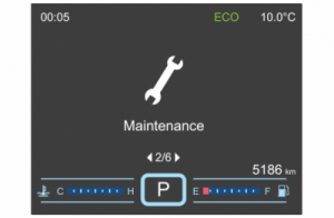 پس از روشن شدن دکمه استارت، سیستم صفحه کیلومتر پس از اتمام خود ارزیابی اگر تشخیص دهد که زمان سرویس دوره ای فرا رسیده است، علامت آچار را در ناحیه B نمایش خواهد داد. دراین حالت صفحه نمایشگر رنگی به شکل زیر تغییر خواهد کرد. همچنین پیغامهای مرتبط با سرویس را در صفحه شرایط خودرو میتوانید مشاهده کنید که در این حالت پیغام “Please maintain the vehicle” نیز نمایش داده خواهد شد.