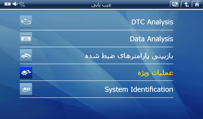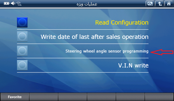 همانطور که در شکل زیر مشاهده می کنید، عملیات ویژه این یونیت به ترتیب شامل: خواندن پیکره بندی، ثبت تاریخ آخرین عملیات تعمیراتی، برنامه ریزی سنسور زاویه ی فرمان و نوشتن وین کد خودرو می باشد.برای کالیبره کردن سنسور زاویه فرمان، گزینه سوم را انتخاب کنید.