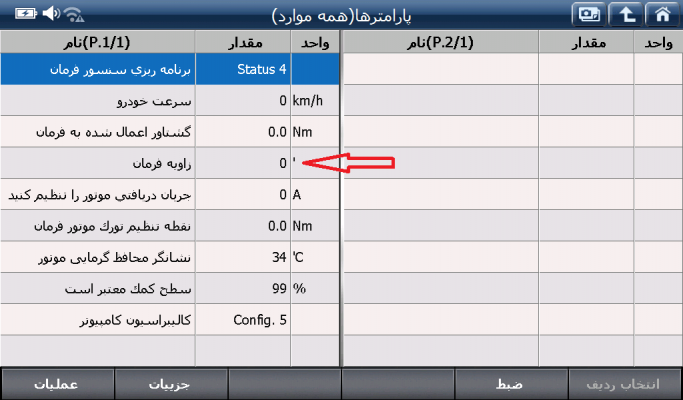 پس از اتمام مراحل کالیبراسیون سنسور زاویه فرمان، وارد پارامترها می شویم و زاویه فرمان را چک می کنیم. زمانی که فرمان مستقیم است، زاویه ی فرمان باید صفر باشد.