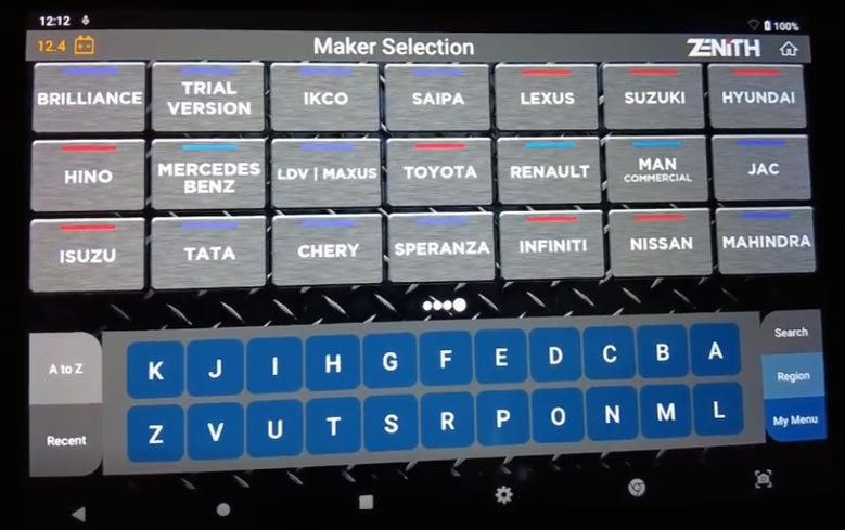 برای آزاد کردن کالیپرها ابتدا دیاگ زنیت Z5 را به خودرو وصل کنید. سپس در صفحه اول هیوندای را انتخاب کنید.