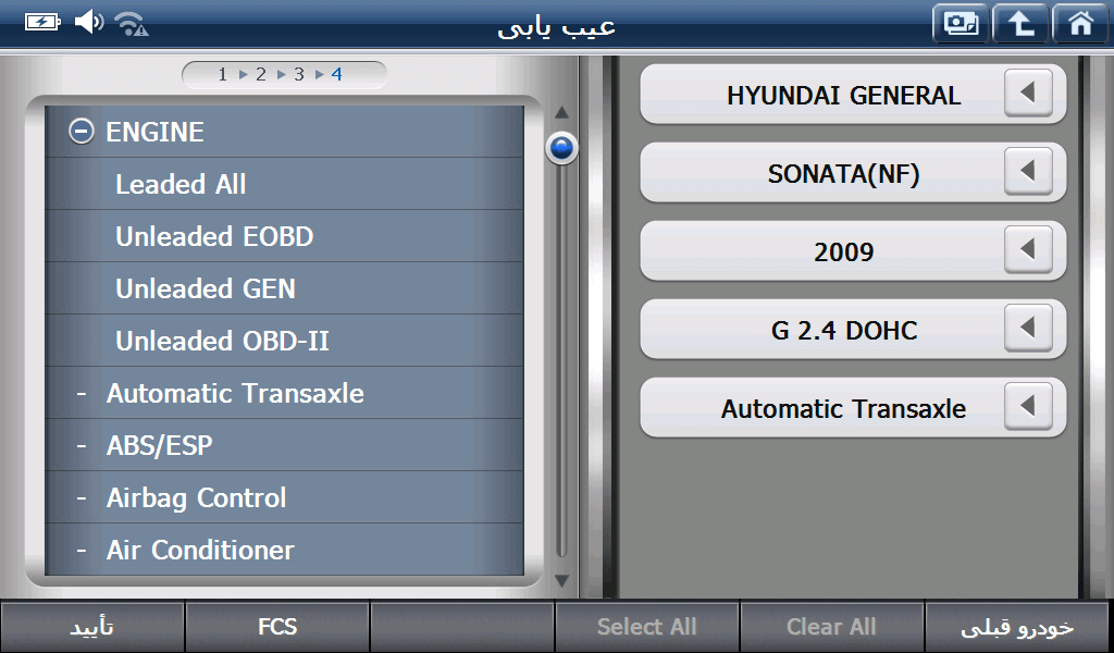 طبق شکل زیر از منوی عیب یابی برند HYUNDAI GENERAL ، سپس خودروی سوناتا NF مدل 2009 با موتور 2400 سی سی و کنترل یونیت گیربکس اتوماتیک (AUTOMATIC TRANSAXLE) را انتخاب می کنیم.