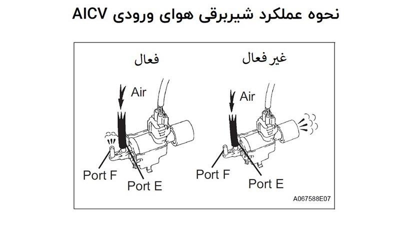 این شیر برقی دارای دو مجرای هوا میباشد. یک مسیر به نام E برای ورود هوا دارد. یک مسیر دیگر هم به نام F برای خروج هوا دارد. در پشت این قطعه یک خروجی اضافی دیگر هم برای خروج هوا دارد. هوا از مسیر E وارد شیر برقی میشود. در زمانی که AICV فعال باشد هوای ورودی به مسیر F هدایت میشود. در زمان غیر فعال بودن، هوای ورودی E به خروجی پشتی هدایت میشود و بدون اینکه وارد مسیر خاصی شود خارج میگردد.