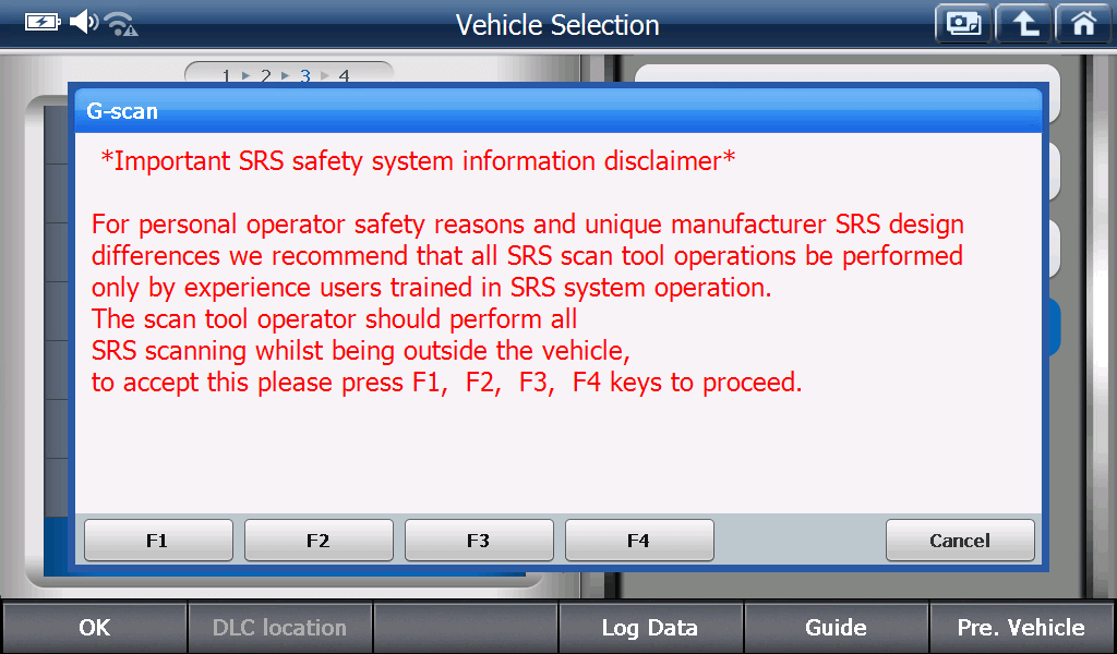 همانطور که در پیغام دستگاه مشاهده می فرمایید، پس از رعایت نکات ایمنی و قبول کردن شرایط عیب یابی باید دکمه های F1,F2,F3,F4 دستگاه جی اسکن را بفشارید تا وارد یونیت ایربگ شوید و بتوانید عملیات عیب یابی را انجام دهید.