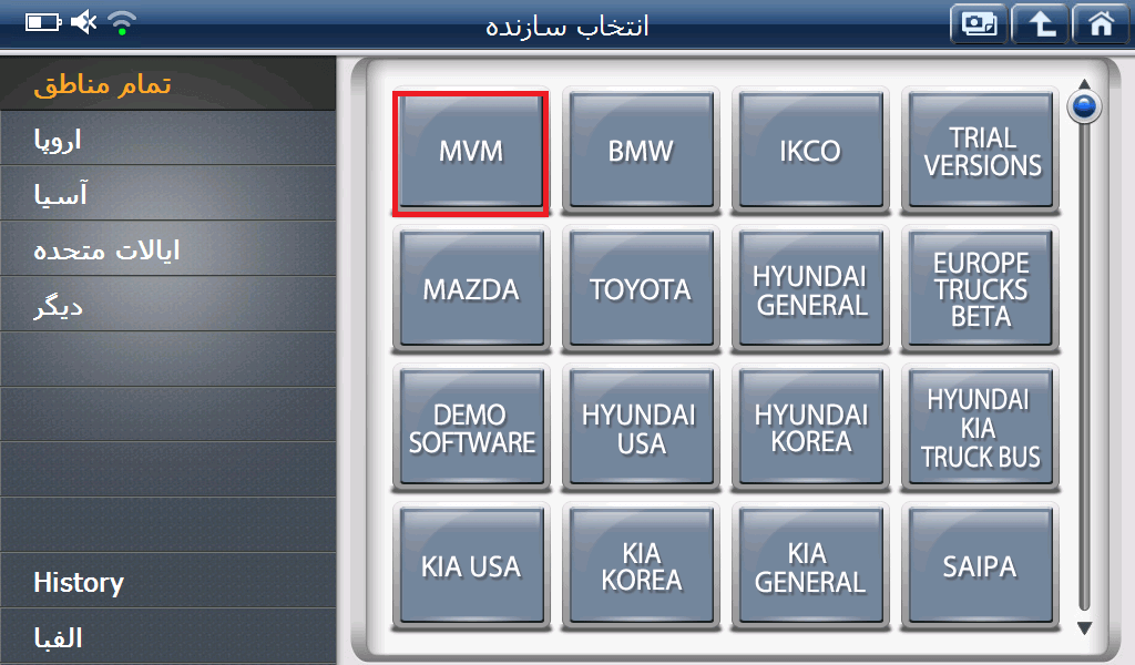 برای دسترسی به این منو، خودروساز MVM را از منوی عیب یابی پیدا کرده و سپس خودرو ی MVM315 را انتخاب و ای سی یو های این خودرو ازجمله موتور، پشت آمپر، ایربگ و … را مشاهده می کنید و برای انجام عملیات تعریف سوییچ وارد گزینه ی ایموبیلایزر میشوید.