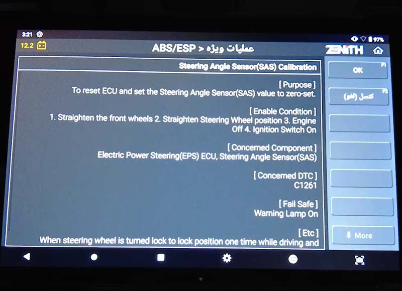 در این منو دستگاه دیاگ Z5 به ما هدف از انجام عملیات، یونیت ها و کدهای خطای مرتب را نمایش میدهد. هدف از انجام این عملیات را همانطور که قبل تر گفتیم تنظیم نقطه صفر فرمان و تعریف این نقطه برای یونیت ESP می باشد. کد خطای C1261 نیز کد خطای مرتبط با این عملیات است. همچنین حالت امن خرابی (FAIL SAFE) روشن شدن چراغ هشدار است.