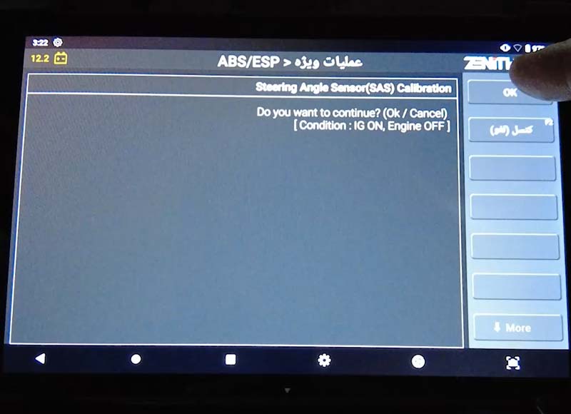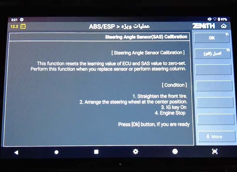 دستگاه شرایط انجام را نیز نمایش میدهد: 1- چرخ ها باید صاف باشند. 2- غربیلک فرمان در وسط قرار گرفته باشد 3- موتور خودرو خاموش باشد 4- سوییچ خودرو باز باشد.