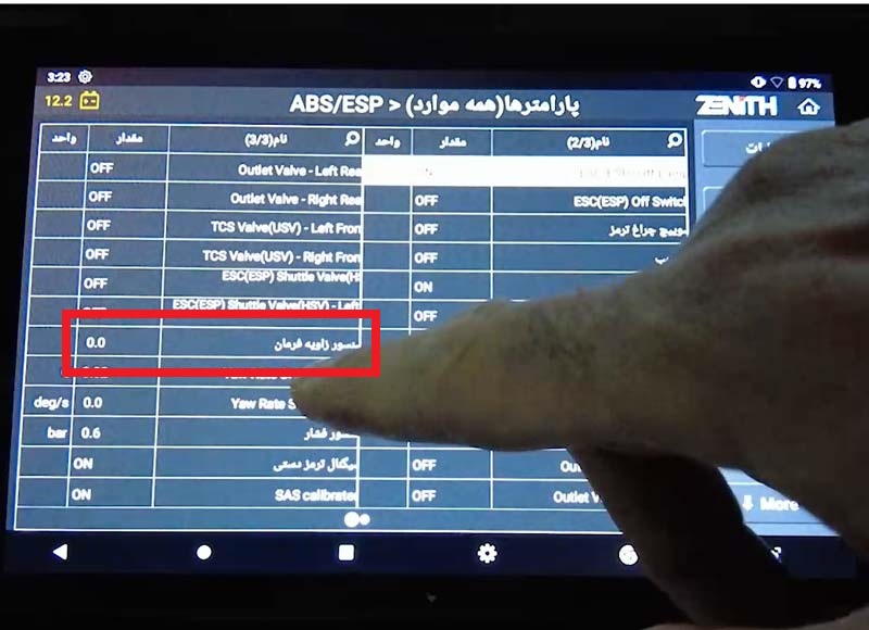 میتوانیم برای اطمینان بیشتر از صحت انجام عملیات، با خودرو رانندگی کنیم و در این حین با دیاگ زنیت Z5 پارامتر سنسور زاویه فرمان را بررسی کنیم.